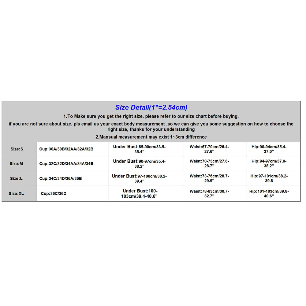 Size Detail(1"=2.54cm) 1.To Make sure you get the right size, please refer to our size chart before buying, if you are not sure about size, pls email us your exact body measurement ,so we can give you some suggestion on how to choose the right size, thanks for your understanding 2.Mansual measurement may exist 1~3cm difference |